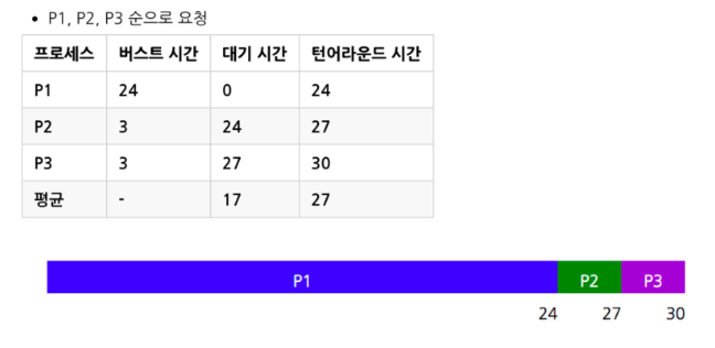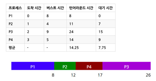 - 일괄처리 시스템에 적합하며 자칫 CPU사용시간이 긴 프로세스가 다른 프로세스들을 대기시킬 수 있으므로 처리율이 떨어질 수 있다는 단점이 있습니다.