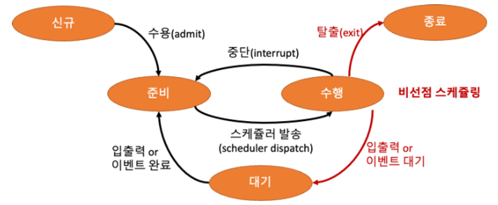 - 수행 -> 대기 (Running->Waiting) : I/O요청이 발생하거나, 자식 프로세스가 종료 대기를 할 때