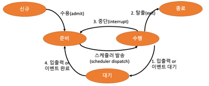 : 스케쥴링 알고리즘에 따라 프로세스들은 상태변화가 일어나며 준비/수행 상태일때 CPU를 사용하게 된다