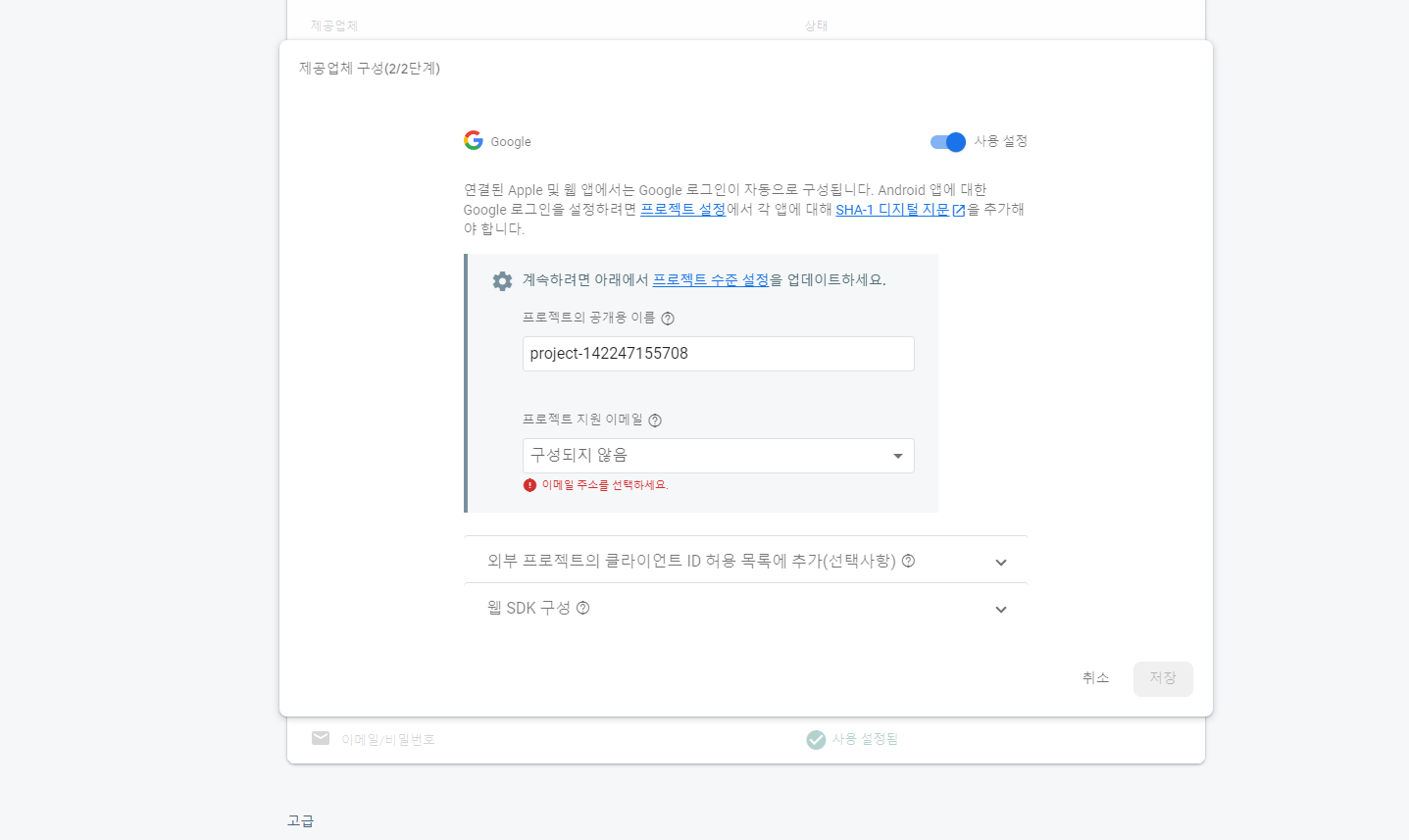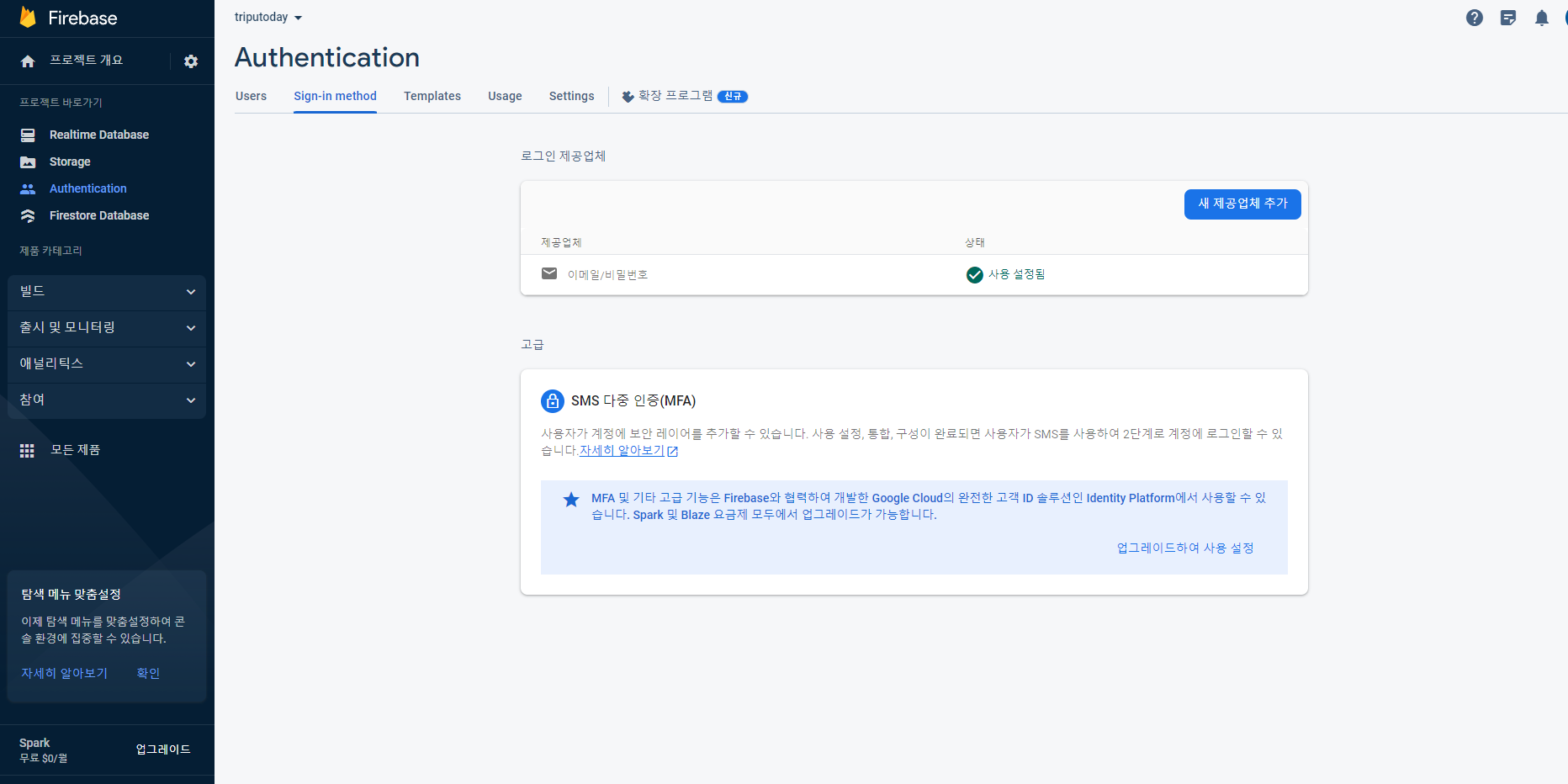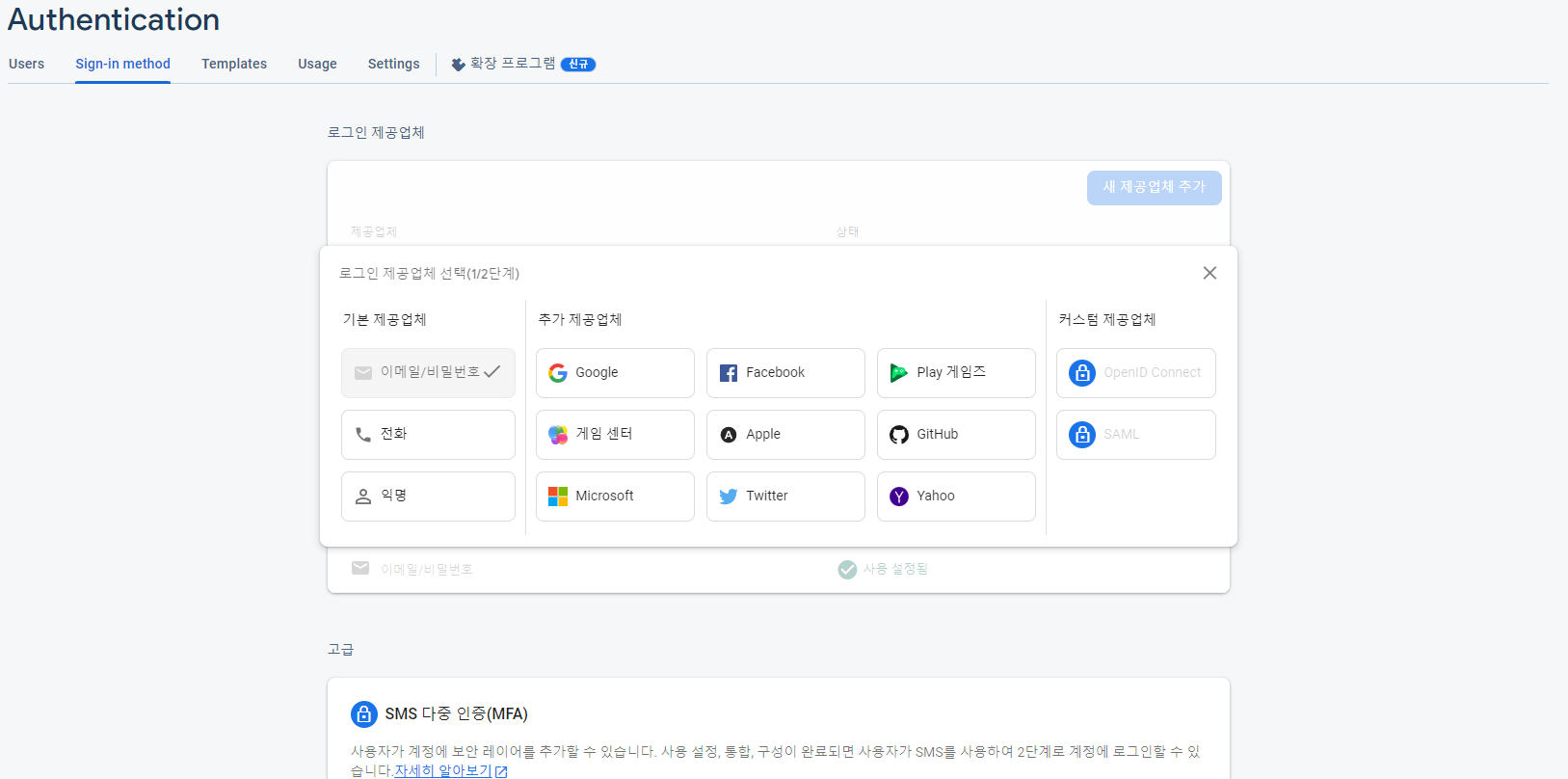 파이어베이스 Authentication 에서 sign-in method 탭으로 들어가서 새 제공업체 추가 !