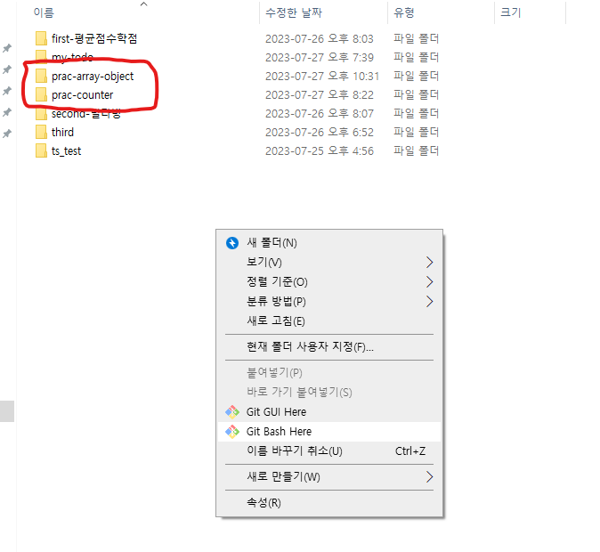 우클릭 > Git Bash Here 클릭 또는 GitBash 에서 경로 이동 (cd ~~)